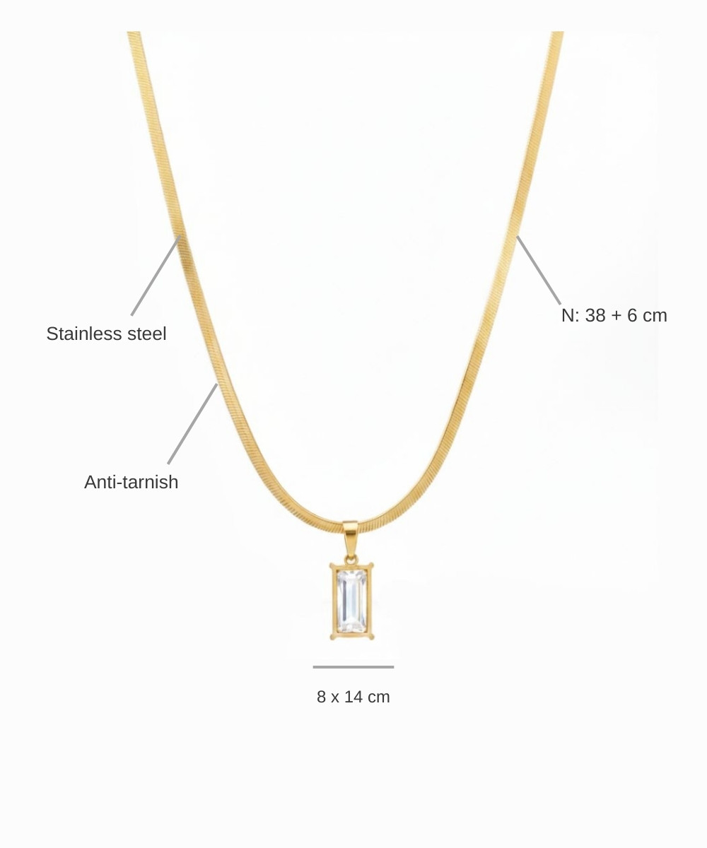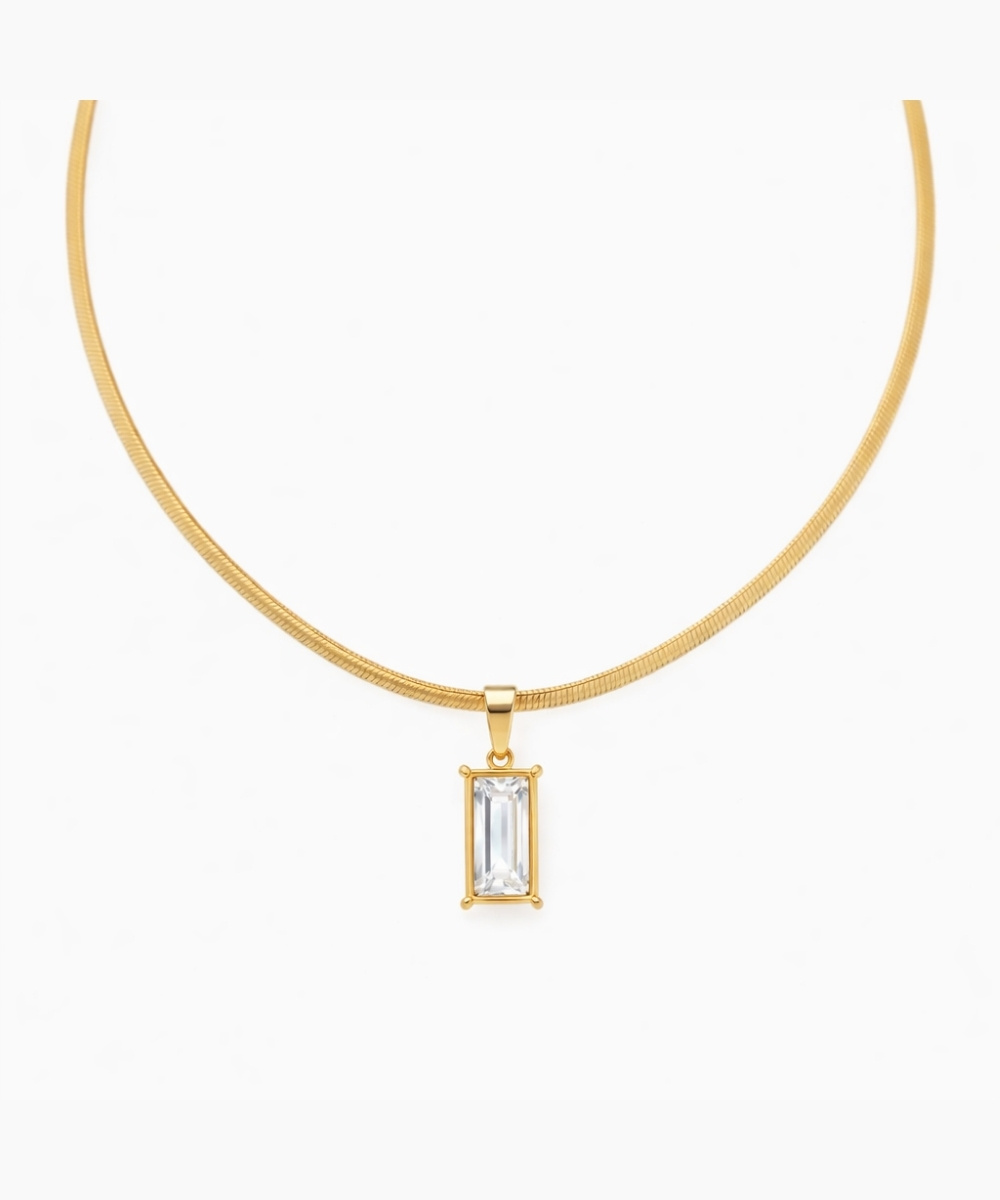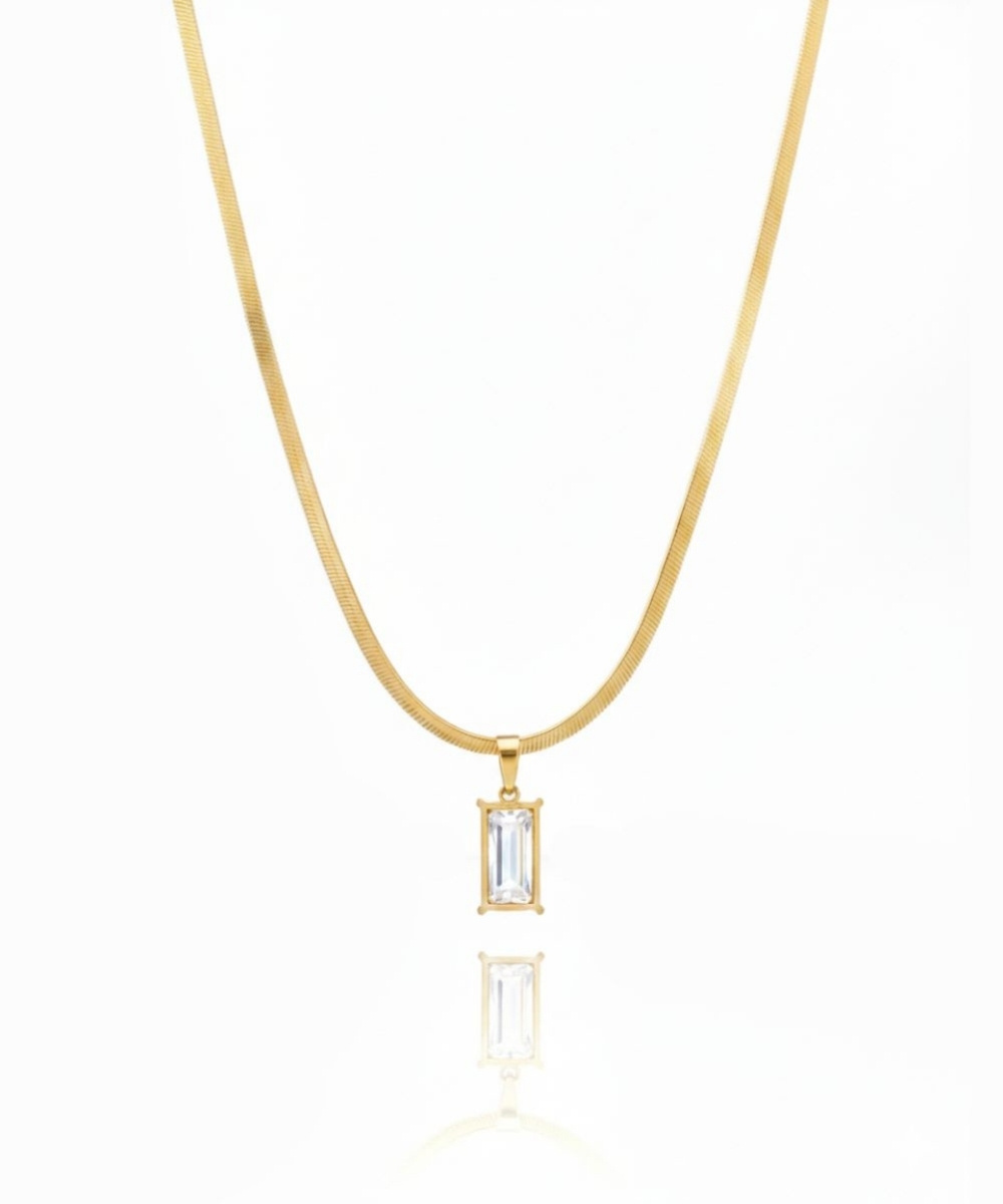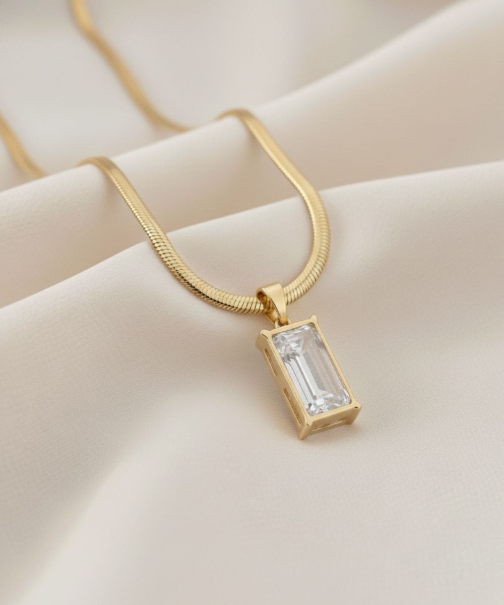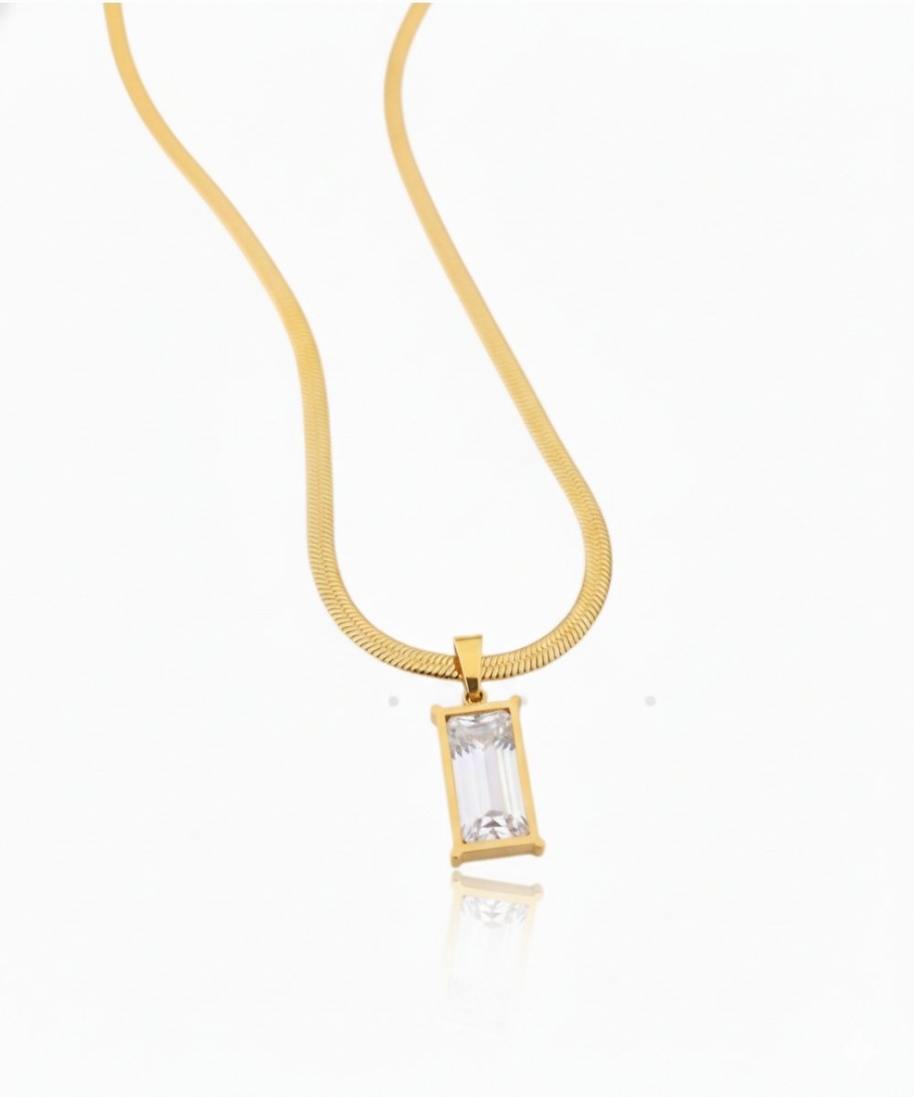 A sleek baguette-style pendant paired with a gold-finish stainless steel snake chain. Minimal, modern, and designed for everyday wear.