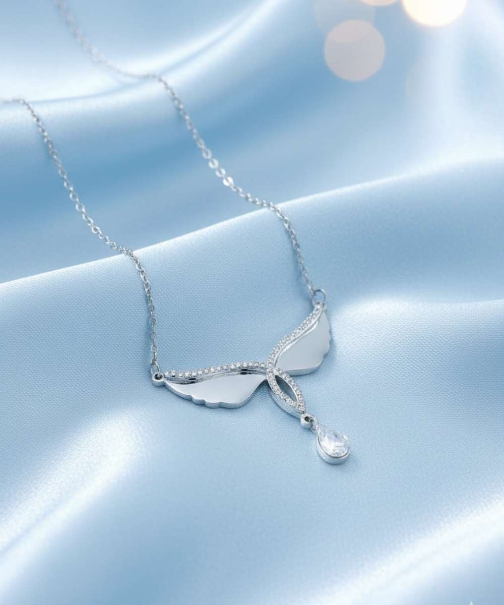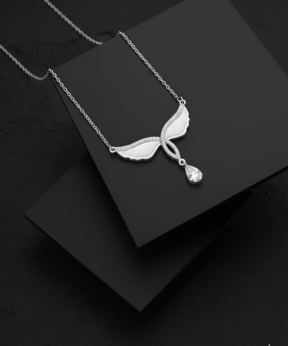 A graceful wing-shaped pendant necklace with crystal detailing and a delicate drop accent, designed for elegant everyday wear.