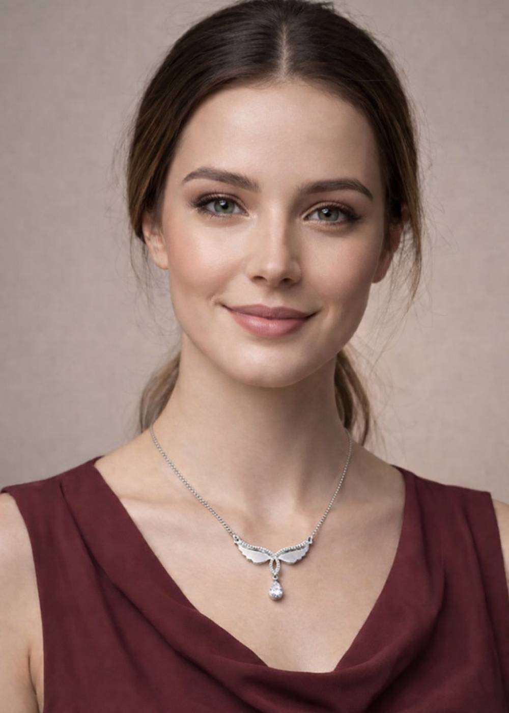 The Crystal Wing Drop Pendant Necklace features a symmetrical wing-inspired design accented with fine crystal detailing along the curves. A slim crystal-set connector leads to a soft teardrop-shaped crystal drop, adding movement and subtle sparkle to the piece.