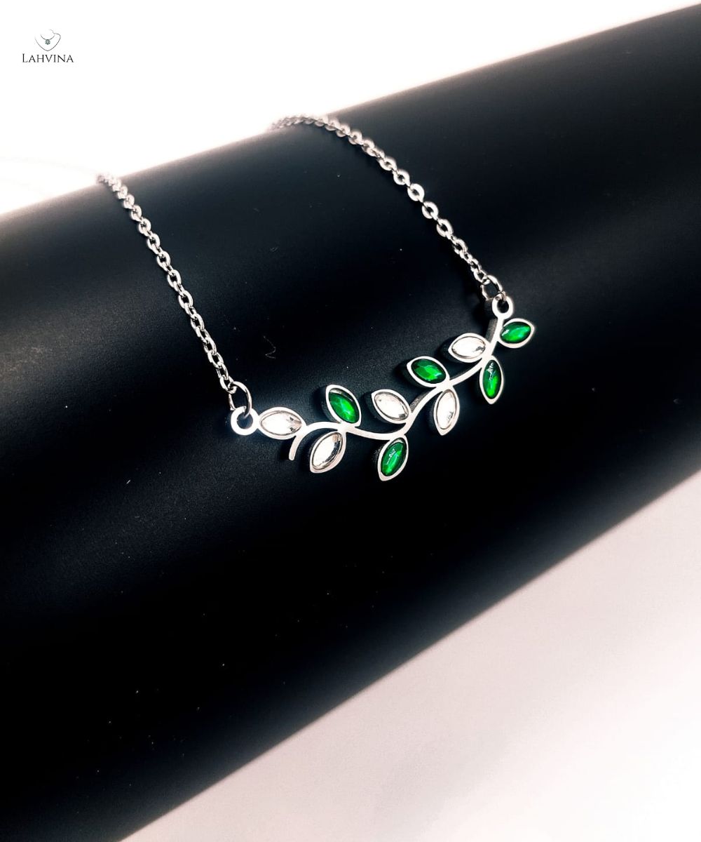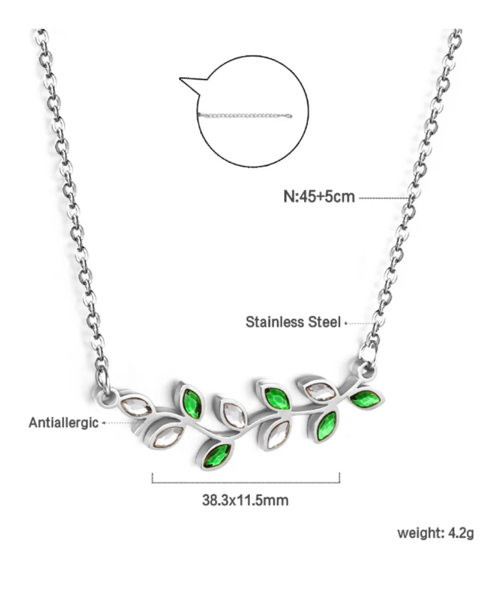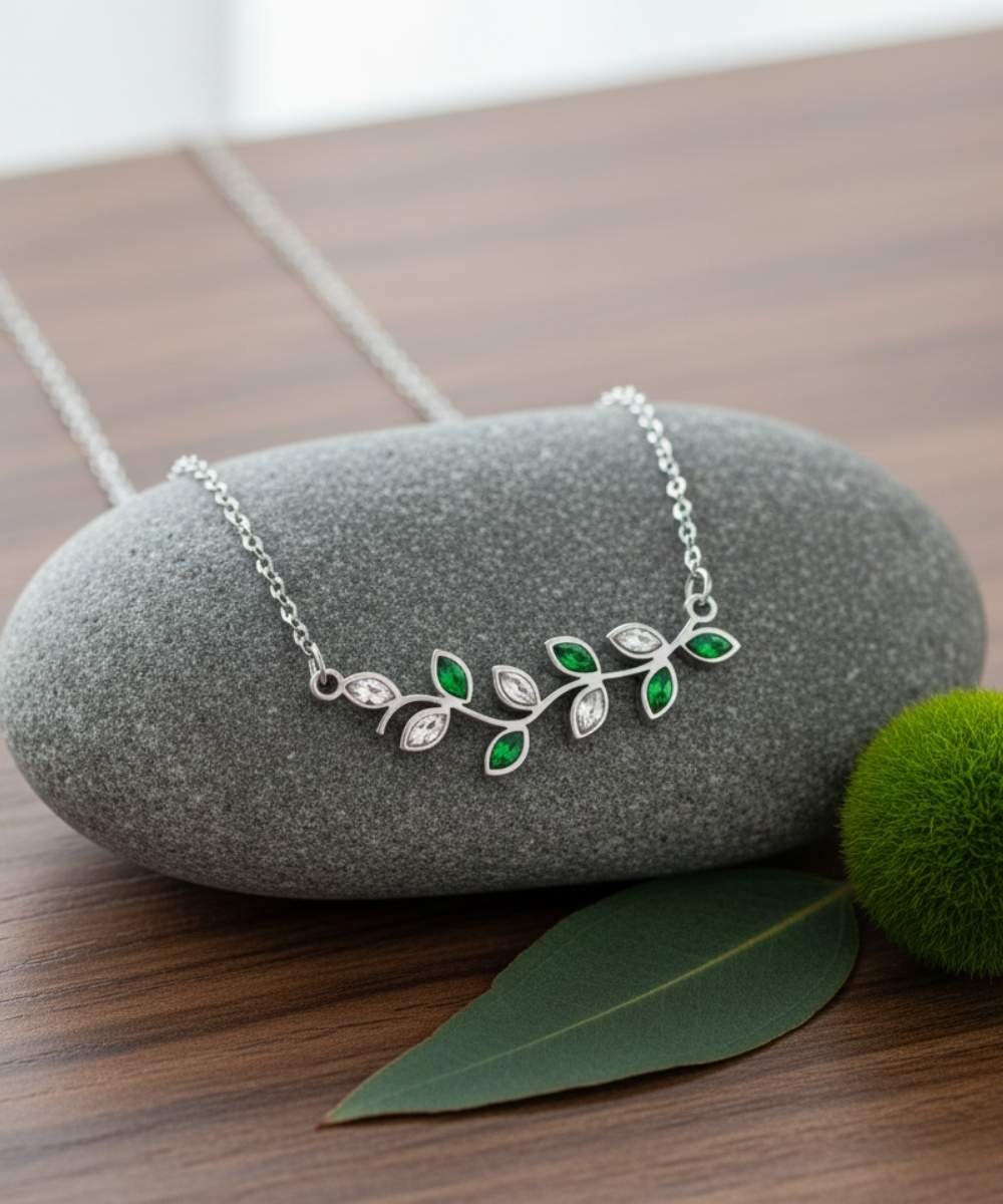 A delicate leaf branch–inspired pendant necklace crafted from 304 stainless steel, featuring emerald green and clear stone detailing. Waterproof, anti-allergic, and designed for elegant everyday wear.
