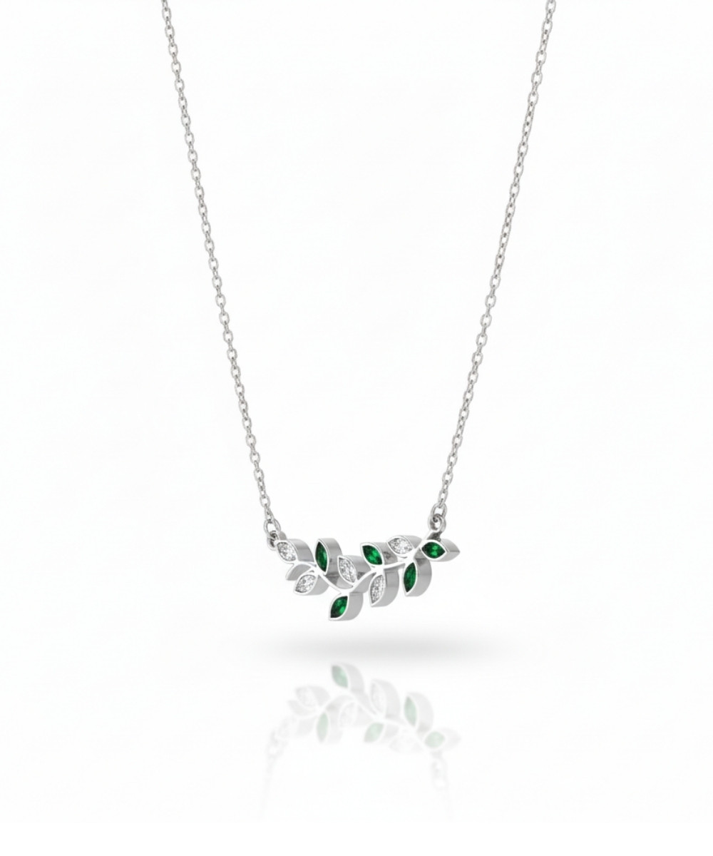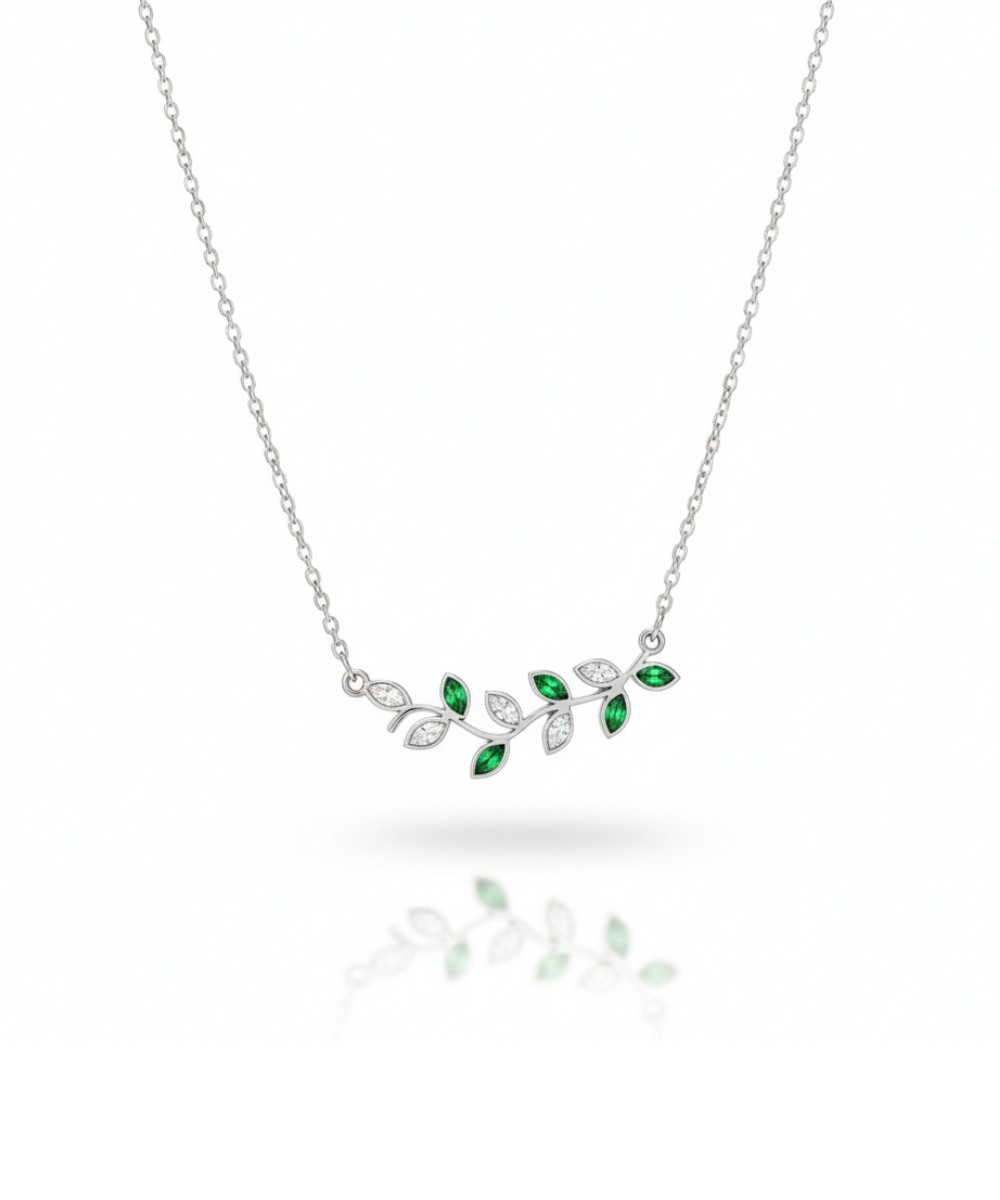 The Emerald Green Leaf Branch Pendant Necklace features a refined horizontal branch design accented with alternating emerald green and clear stones. The leaf motif adds a natural, graceful touch while maintaining a clean and minimal overall look.