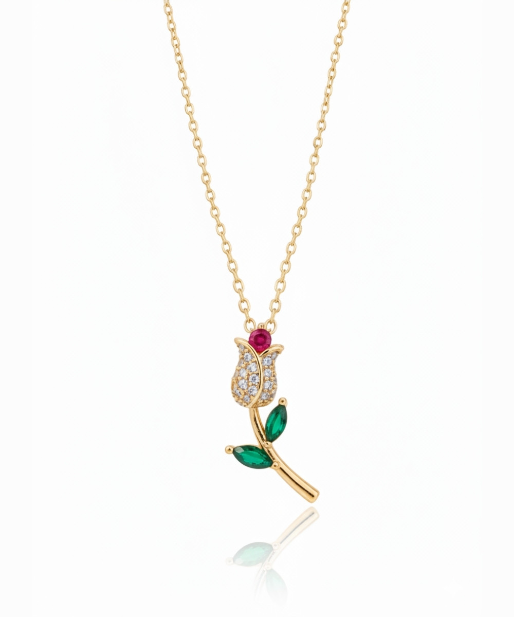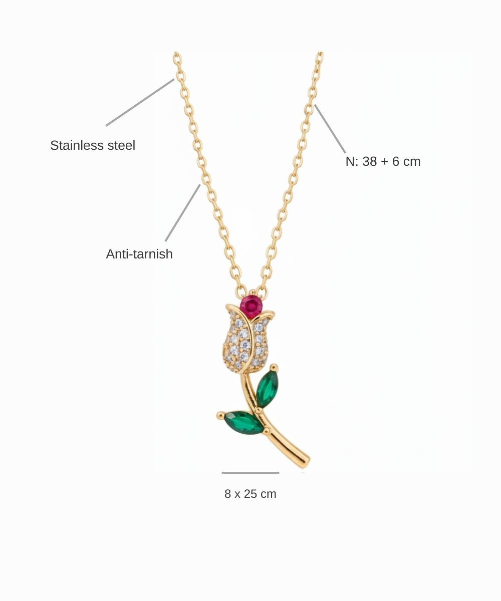 A delicate rose-inspired pendant necklace with rhinestone detailing, paired with a stainless steel link chain for everyday styling.