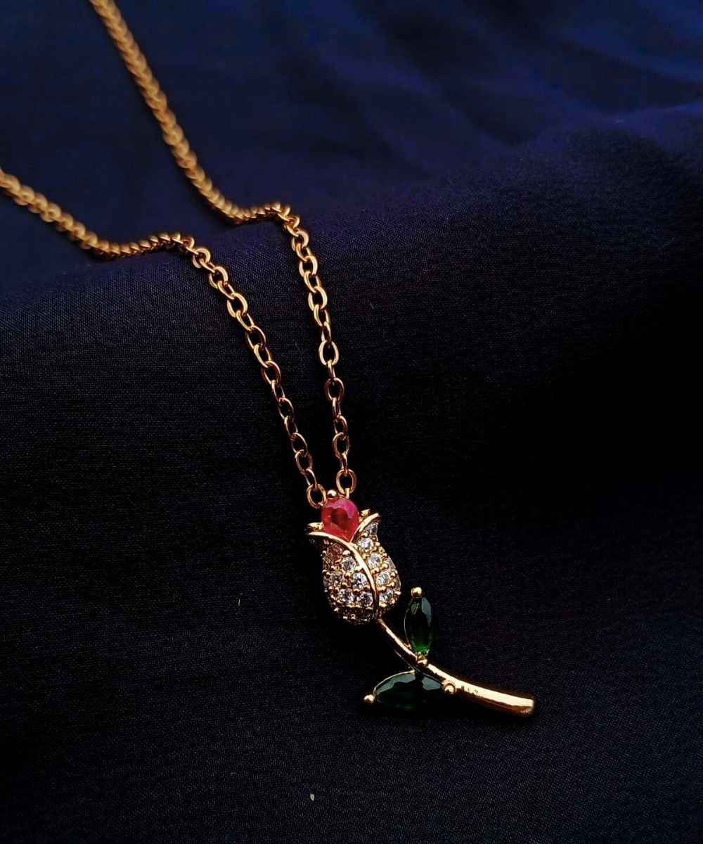 The pendant showcases a floral rose design accented with rhinestone detailing, finished in a gold-tone look. It is paired with a stainless steel link chain, offering better durability and everyday wear comfort compared to regular fashion chains. The necklace is secured with a lobster clasp for ease of use and a secure fit.