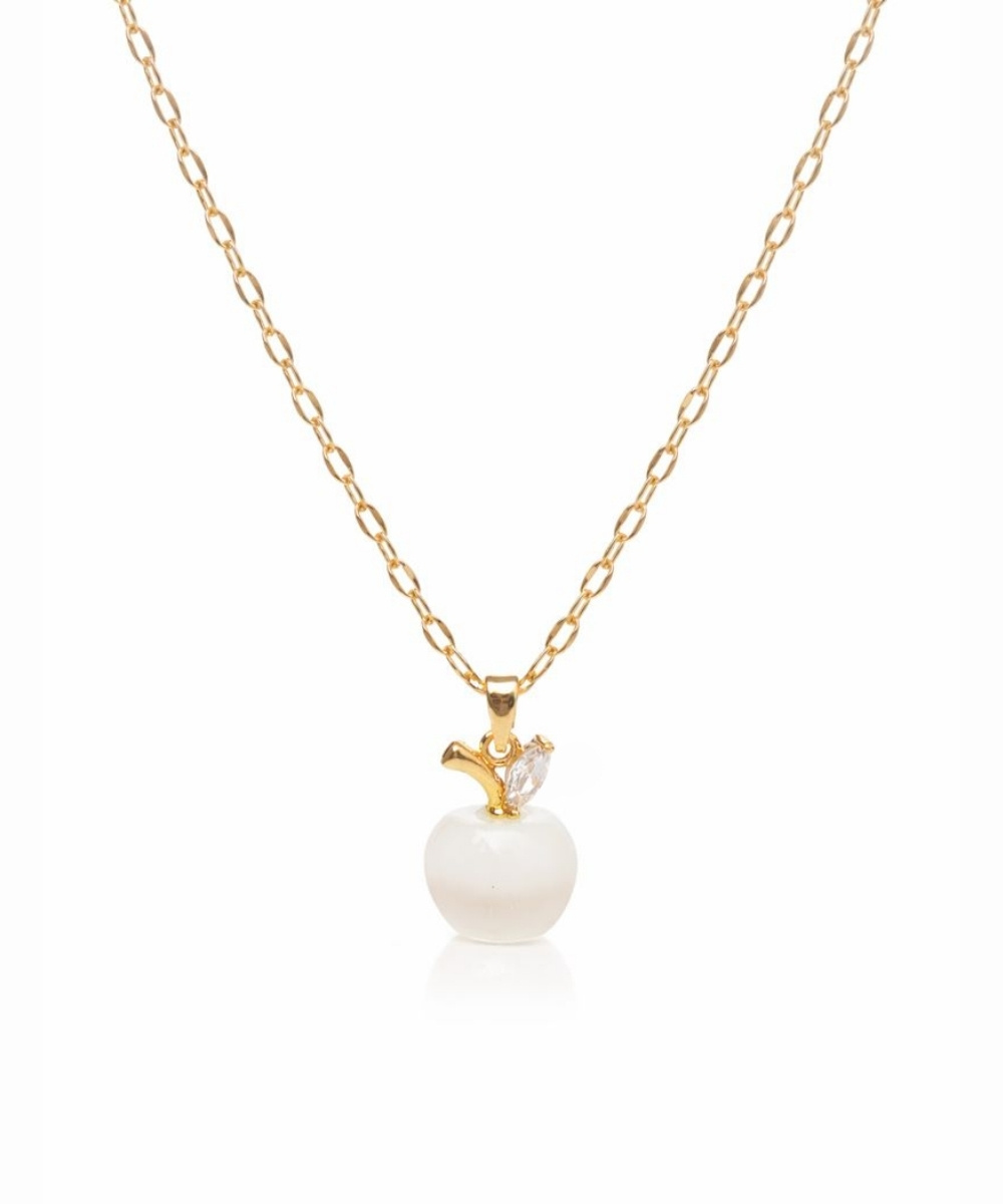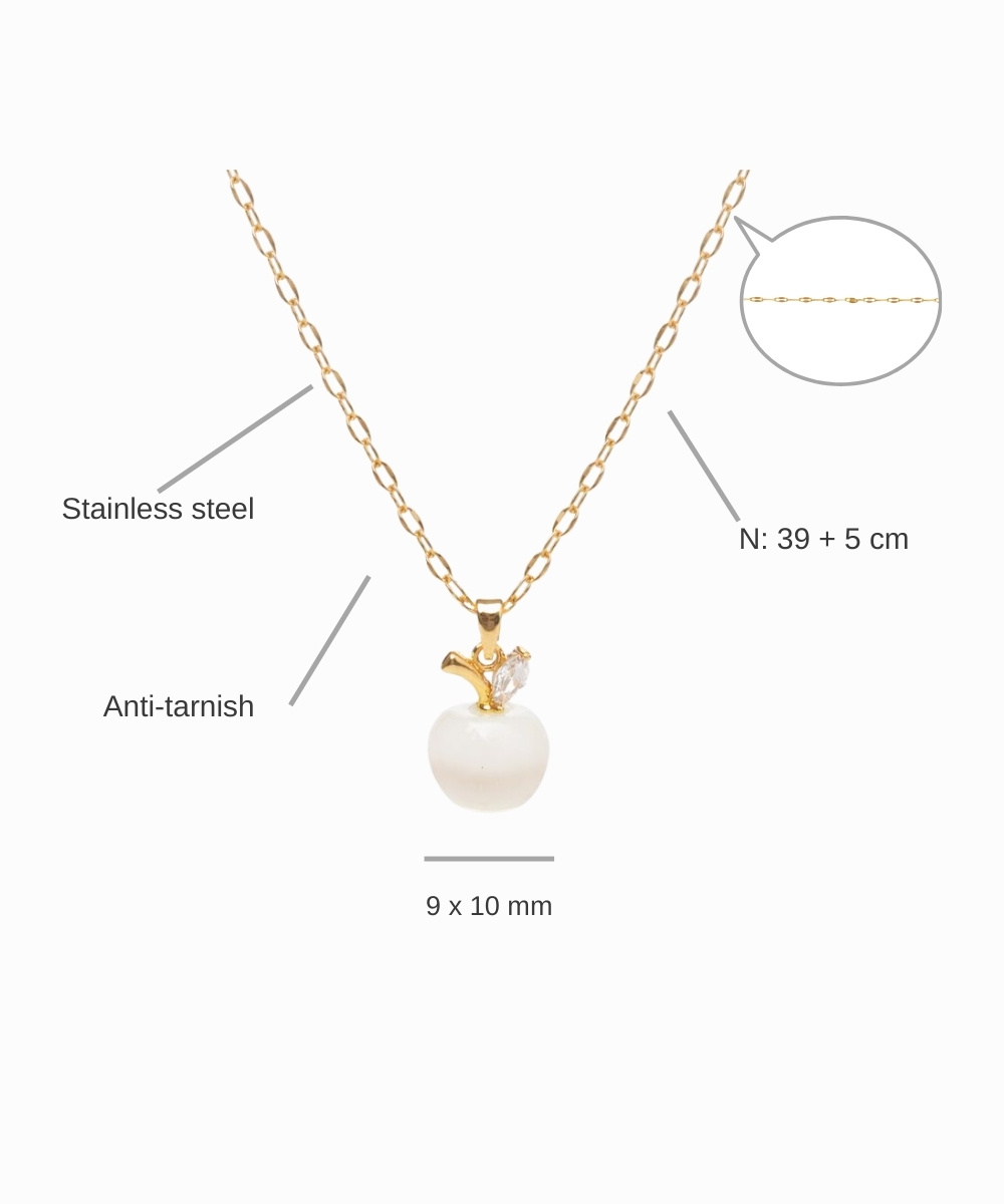 Featuring a 9 × 10 mm apple-shaped pearl pendant, this piece offers a soft, playful silhouette while keeping the look minimal and refined. The pendant is paired with a gold-plated stainless steel chain finished with anti-tarnish properties, helping maintain its shine longer with proper care.