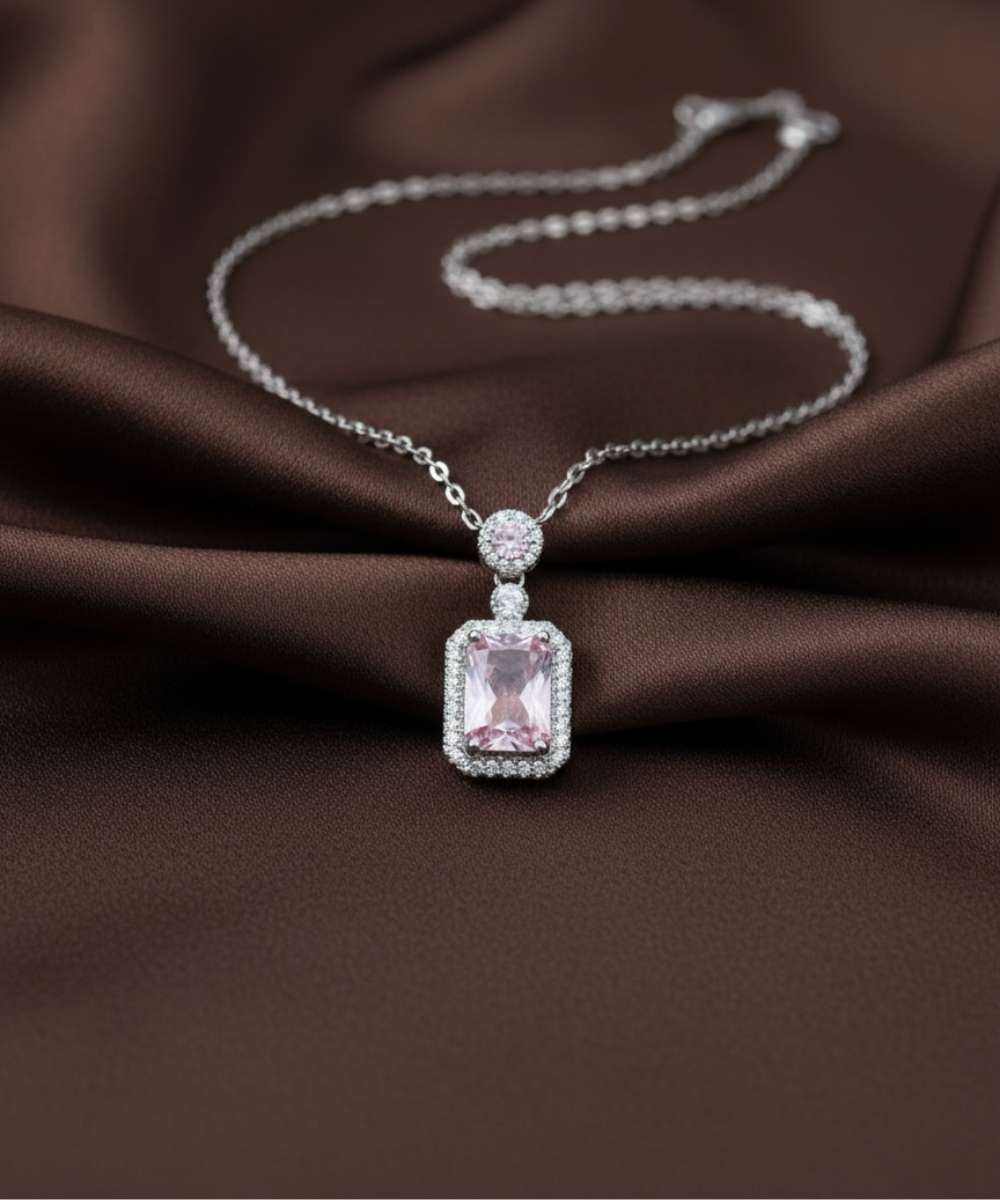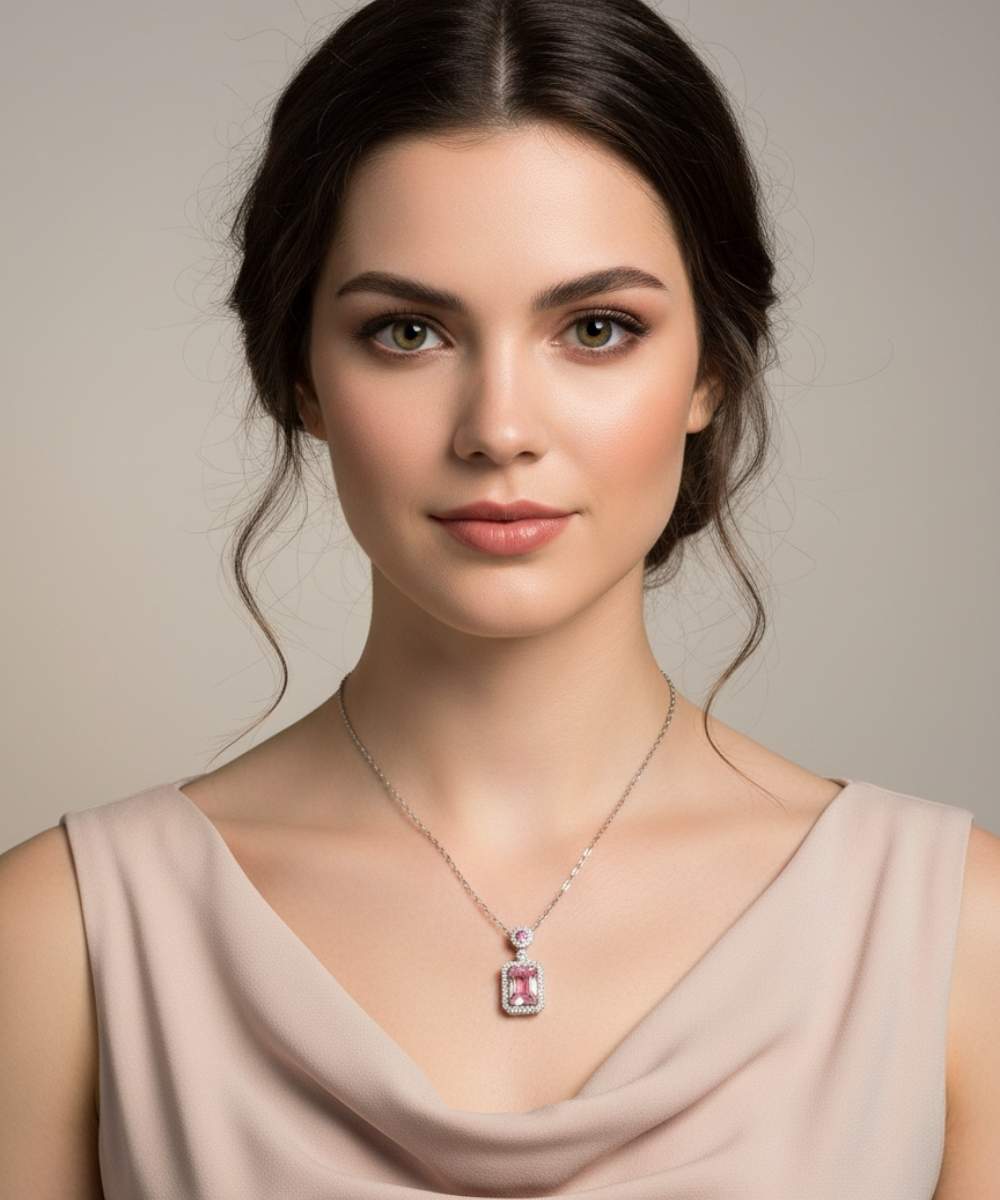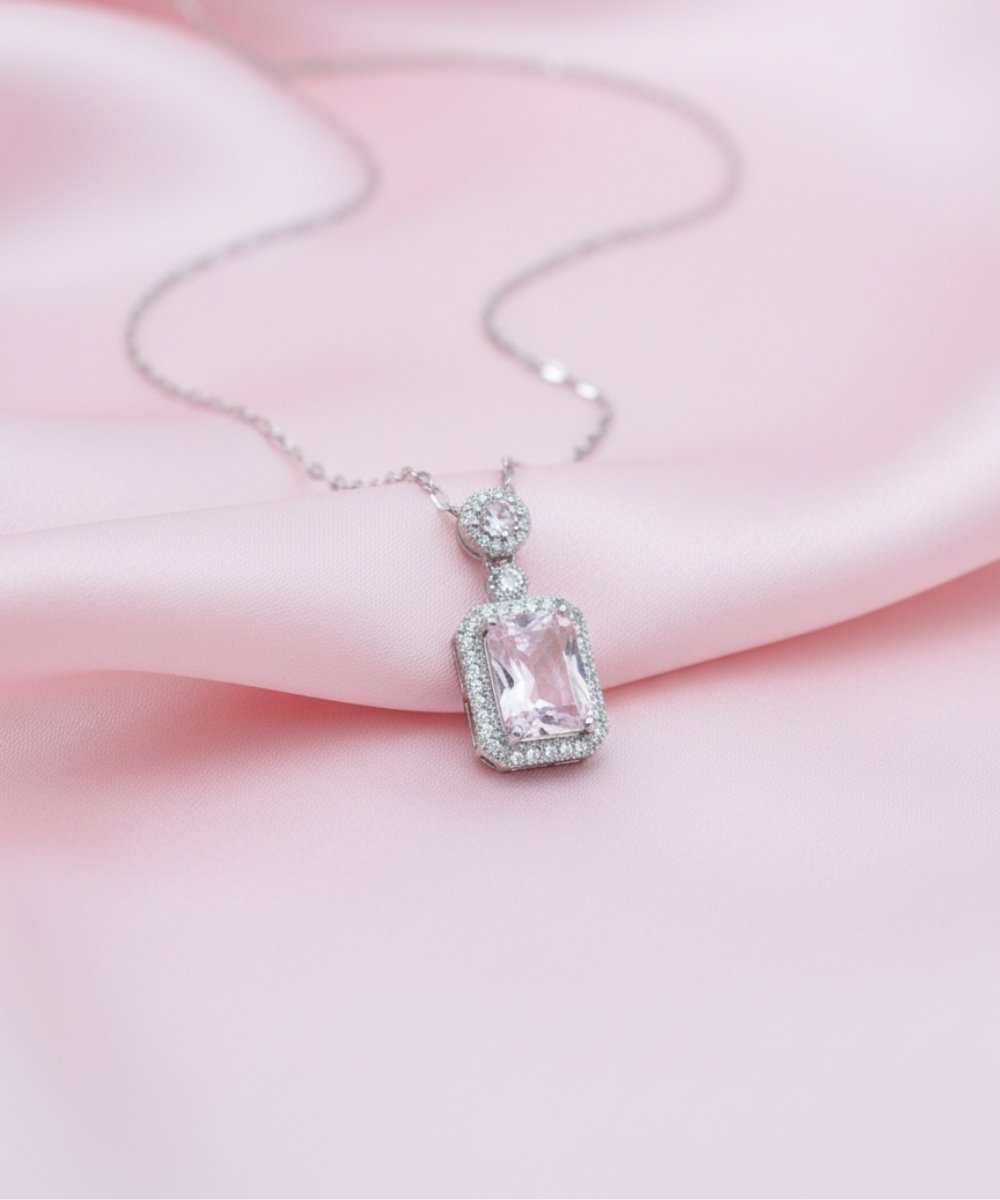 The Pink Zircon Halo Solitaire Pendant Necklace showcases a rectangular pink zircon centerpiece framed by a delicate halo border. A smaller round zircon accent above the main pendant adds subtle brilliance, enhancing the overall symmetry of the design.