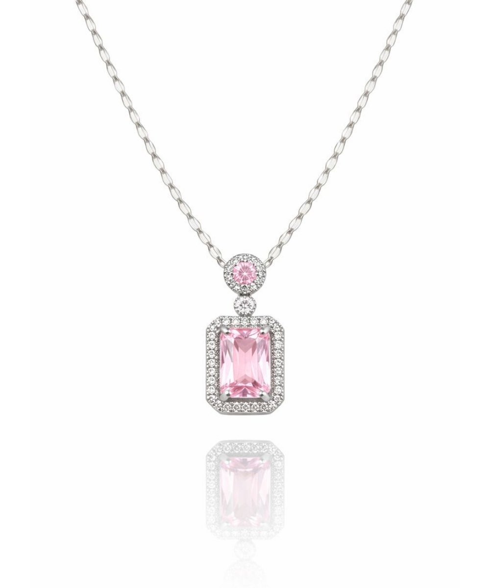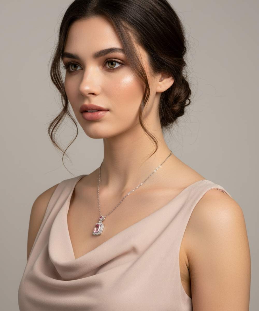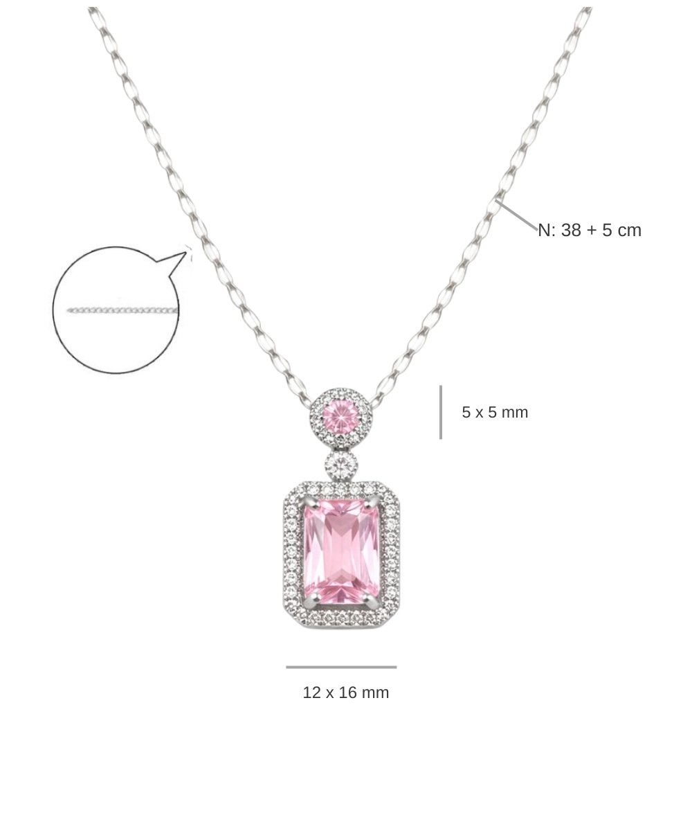 The Pink Zircon Halo Solitaire Pendant Necklace showcases a rectangular pink zircon centerpiece framed by a delicate halo border. A smaller round zircon accent above the main pendant adds subtle brilliance, enhancing the overall symmetry of the design.